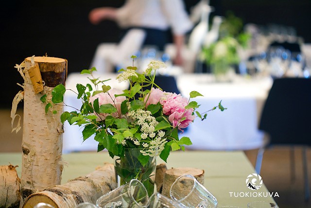 Valitsimme Maunviljelijät vastaamaan hääillallisesta ja koristeluista. Pirjo Päivärinta tiimeineen takasi että kaikki pääsivät nauttimaan Hämeen vesistä pyydetystä kuhasta, lähimetsästä kaadetusta hirvestä ja suloisen makeasta Britakakusta. Viinit ja myöhäisillan virvokkeet saimme tuoda paikalle itse.
